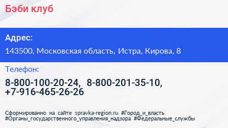 Бэби-клуб по адресу 143500, Московская область, Истра, Кирова, 8 в дальнейшем Организация, размещена в следующих категориях: