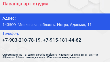 Лаванда, арт-студия по адресу 143500, Московская область, Истра, Адасько, 11 в дальнейшем Организация, размещена в следующих категориях: