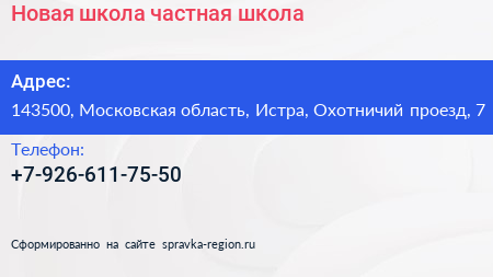 Новая школа, частная школа по адресу 143500, Московская область, Истра, Охотничий проезд, 7 в дальнейшем Организация, размещена в следующих категориях:
