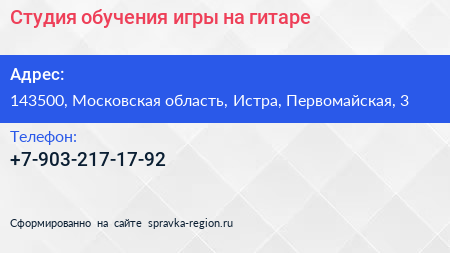Студия обучения игры на гитаре по адресу 143500, Московская область, Истра, Первомайская, 3 в дальнейшем Организация, размещена в следующих категориях:
