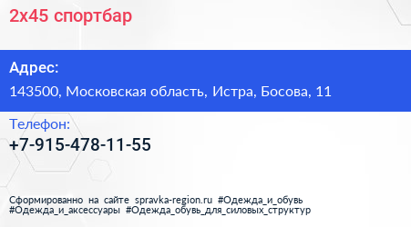 2х45, спортбар по адресу 143500, Московская область, Истра, Босова, 11 в дальнейшем Организация, размещена в следующих категориях: