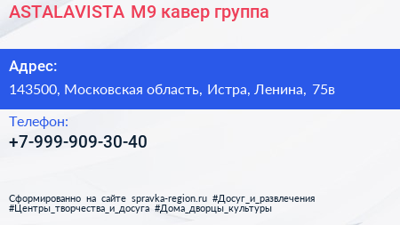 ASTALAVISTA & M9, кавер-группа по адресу 143500, Московская область, Истра, Ленина, 75в в дальнейшем Организация, размещена в следующих категориях: