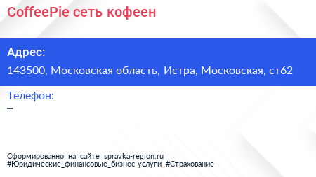CoffeePie, сеть кофеен по адресу 143500, Московская область, Истра, Московская, ст62 в дальнейшем Организация, размещена в следующих категориях: