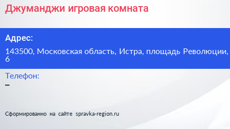 Джуманджи, игровая комната по адресу 143500, Московская область, Истра, площадь Революции, 6 в дальнейшем Организация, размещена в следующих категориях: