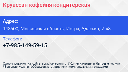 Круассан, кофейня-кондитерская по адресу 143500, Московская область, Истра, Адасько, 7 к3 в дальнейшем Организация, размещена в следующих категориях: