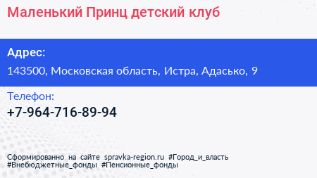 Маленький Принц, детский клуб по адресу 143500, Московская область, Истра, Адасько, 9 в дальнейшем Организация, размещена в следующих категориях: