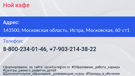 Ной, кафе по адресу 143500, Московская область, Истра, Московская, 60 ст1 в дальнейшем Организация, размещена в следующих категориях: