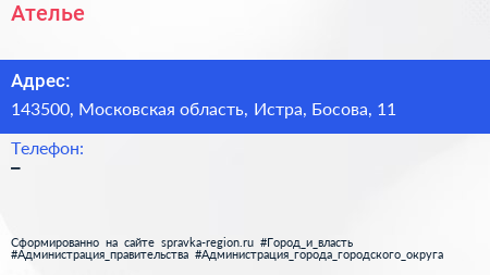 Ателье по адресу 143500, Московская область, Истра, Босова, 11 в дальнейшем Организация, размещена в следующих категориях: