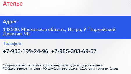 Ателье по адресу 143500, Московская область, Истра, 9 Гвардейской Дивизии, 9Б в дальнейшем Организация, размещена в следующих категориях: