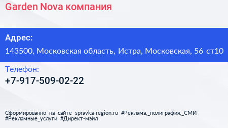 Garden Nova, компания по адресу 143500, Московская область, Истра, Московская, 56 ст10 в дальнейшем Организация, размещена в следующих категориях: