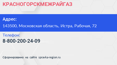 КРАСНОГОРСКМЕЖРАЙГАЗ по адресу 143500, Московская область, Истра, Рабочая, 72 в дальнейшем Организация, размещена в следующих категориях: