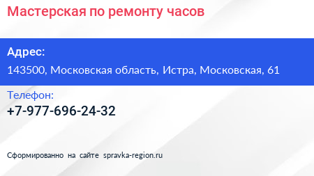 Мастерская по ремонту часов по адресу 143500, Московская область, Истра, Московская, 61 в дальнейшем Организация, размещена в следующих категориях: