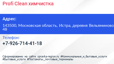 Profi & Clean, химчистка по адресу 143500, Московская область, Истра, деревня Вельяминово, 48 в дальнейшем Организация, размещена в следующих категориях: