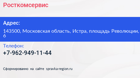Росткомсервис по адресу 143500, Московская область, Истра, площадь Революции, 6 в дальнейшем Организация, размещена в следующих категориях: