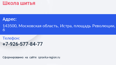 Школа шитья по адресу 143500, Московская область, Истра, площадь Революции, 6 в дальнейшем Организация, размещена в следующих категориях: