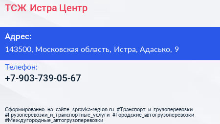 ТСЖ Истра-Центр по адресу 143500, Московская область, Истра, Адасько, 9 в дальнейшем Организация, размещена в следующих категориях: