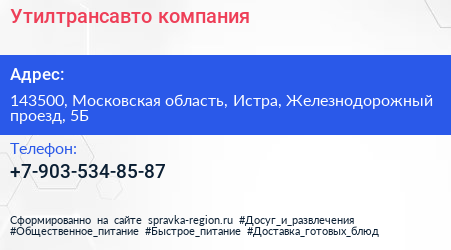 Утилтрансавто, компания по адресу 143500, Московская область, Истра, Железнодорожный проезд, 5Б в дальнейшем Организация, размещена в следующих категориях: