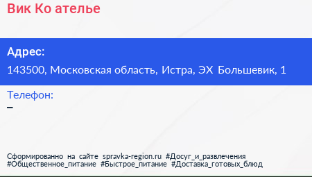 Вик Ко, ателье по адресу 143500, Московская область, Истра, ЭХ Большевик, 1 в дальнейшем Организация, размещена в следующих категориях: