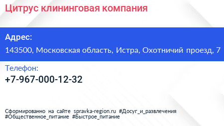 Цитрус, клининговая компания по адресу 143500, Московская область, Истра, Охотничий проезд, 7 в дальнейшем Организация, размещена в следующих категориях: