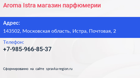 Aroma Istra, магазин парфюмерии по адресу 143502, Московская область, Истра, Почтовая, 2 в дальнейшем Организация, размещена в следующих категориях: