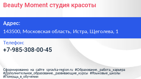 Beauty Moment, студия красоты по адресу 143500, Московская область, Истра, Щеголева, 1 в дальнейшем Организация, размещена в следующих категориях: