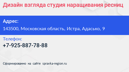 Дизайн взгляда, студия наращивания ресниц по адресу 143500, Московская область, Истра, Адасько, 9 в дальнейшем Организация, размещена в следующих категориях: