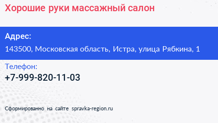 Хорошие руки, массажный салон по адресу 143500, Московская область, Истра, улица Рябкина, 1 в дальнейшем Организация, размещена в следующих категориях:
