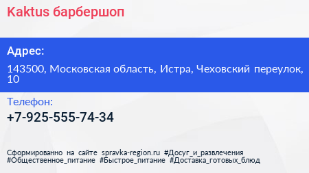 Kaktus, барбершоп по адресу 143500, Московская область, Истра, Чеховский переулок, 10 в дальнейшем Организация, размещена в следующих категориях:
