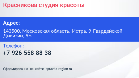 Красникова, студия красоты по адресу 143500, Московская область, Истра, 9 Гвардейской Дивизии, 9Б в дальнейшем Организация, размещена в следующих категориях: