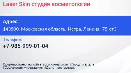 Laser Skin, студия косметологии по адресу 143500, Московская область, Истра, Ленина, 75 ст3 в дальнейшем Организация, размещена в следующих категориях: