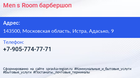 Men`s Room, барбершоп по адресу 143500, Московская область, Истра, Адасько, 9 в дальнейшем Организация, размещена в следующих категориях: