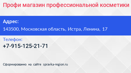 Профи, магазин профессиональной косметики по адресу 143500, Московская область, Истра, Ленина, 17 в дальнейшем Организация, размещена в следующих категориях: