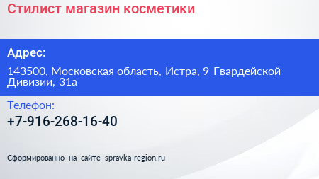 Стилист, магазин косметики по адресу 143500, Московская область, Истра, 9 Гвардейской Дивизии, 31а в дальнейшем Организация, размещена в следующих категориях: