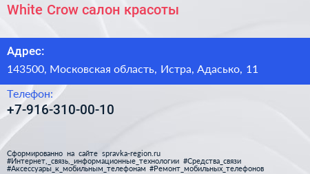 White Crow, салон красоты по адресу 143500, Московская область, Истра, Адасько, 11 в дальнейшем Организация, размещена в следующих категориях:
