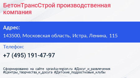БетонТрансСтрой, производственная компания по адресу 143500, Московская область, Истра, Ленина, 115 в дальнейшем Организация, размещена в следующих категориях: