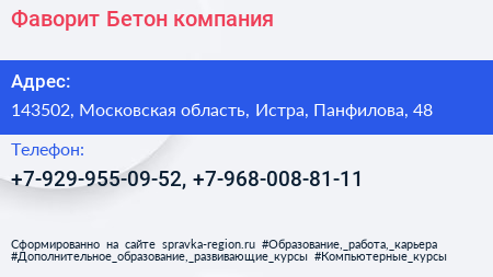 Фаворит Бетон, компания по адресу 143502, Московская область, Истра, Панфилова, 48 в дальнейшем Организация, размещена в следующих категориях: