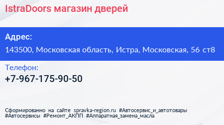 IstraDoors, магазин дверей по адресу 143500, Московская область, Истра, Московская, 56 ст8 в дальнейшем Организация, размещена в следующих категориях: