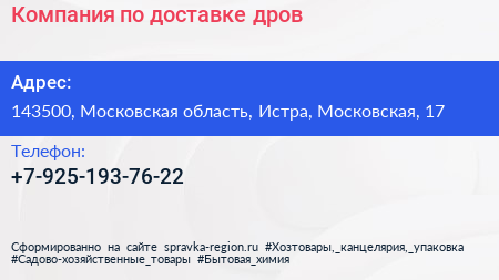 Компания по доставке дров по адресу 143500, Московская область, Истра, Московская, 17 в дальнейшем Организация, размещена в следующих категориях: