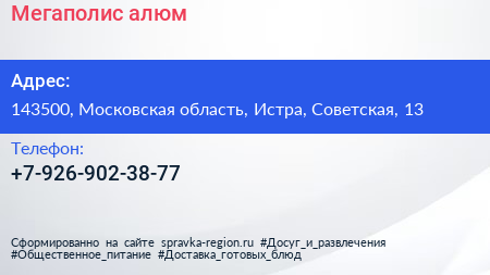 Мегаполис-алюм по адресу 143500, Московская область, Истра, Советская, 13 в дальнейшем Организация, размещена в следующих категориях:
