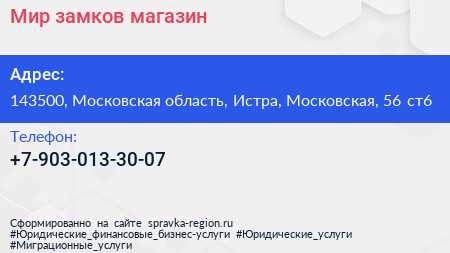 Мир замков, магазин по адресу 143500, Московская область, Истра, Московская, 56 ст6 в дальнейшем Организация, размещена в следующих категориях:
