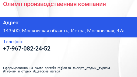 Олимп, производственная компания по адресу 143500, Московская область, Истра, Московская, 47а в дальнейшем Организация, размещена в следующих категориях: