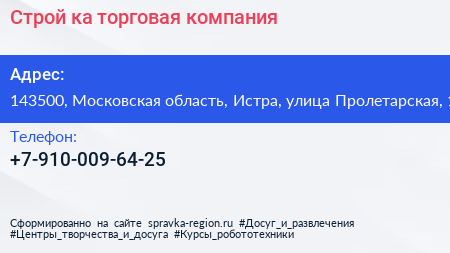Строй-ка, торговая компания по адресу 143500, Московская область, Истра, улица Пролетарская, 1 в дальнейшем Организация, размещена в следующих категориях: