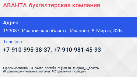 АВАНТА, бухгалтерская компания по адресу 153037, Ивановская область, Иваново, 8 Марта, 32Б в дальнейшем Организация, размещена в следующих категориях: