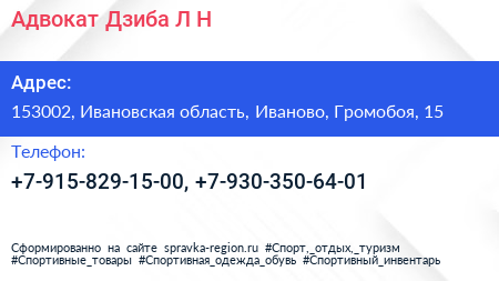 Адвокат Дзиба Л.Н. по адресу 153002, Ивановская область, Иваново, Громобоя, 15 в дальнейшем Организация, размещена в следующих категориях:
