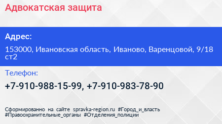 Адвокатская защита по адресу 153000, Ивановская область, Иваново, Варенцовой, 9/18 ст2 в дальнейшем Организация, размещена в следующих категориях: