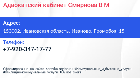 Адвокатский кабинет Смирнова В.М. по адресу 153002, Ивановская область, Иваново, Громобоя, 15 в дальнейшем Организация, размещена в следующих категориях: