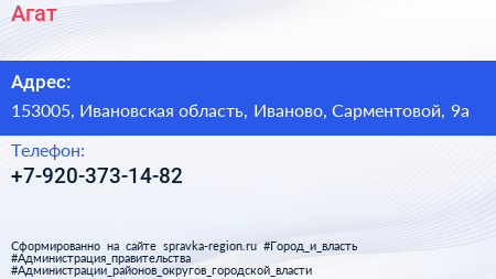 Агат по адресу 153005, Ивановская область, Иваново, Сарментовой, 9а в дальнейшем Организация, размещена в следующих категориях: