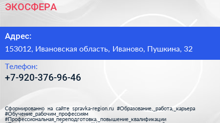 ЭКОСФЕРА по адресу 153012, Ивановская область, Иваново, Пушкина, 32 в дальнейшем Организация, размещена в следующих категориях: