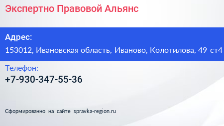 Экспертно-Правовой Альянс по адресу 153012, Ивановская область, Иваново, Колотилова, 49 ст4 в дальнейшем Организация, размещена в следующих категориях: