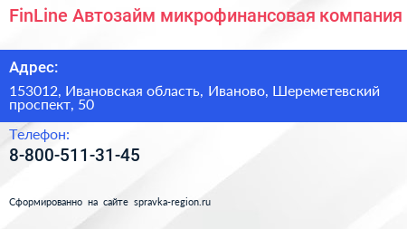 FinLine-Автозайм, микрофинансовая компания по адресу 153012, Ивановская область, Иваново, Шереметевский проспект, 50 в дальнейшем Организация, размещена в следующих категориях: